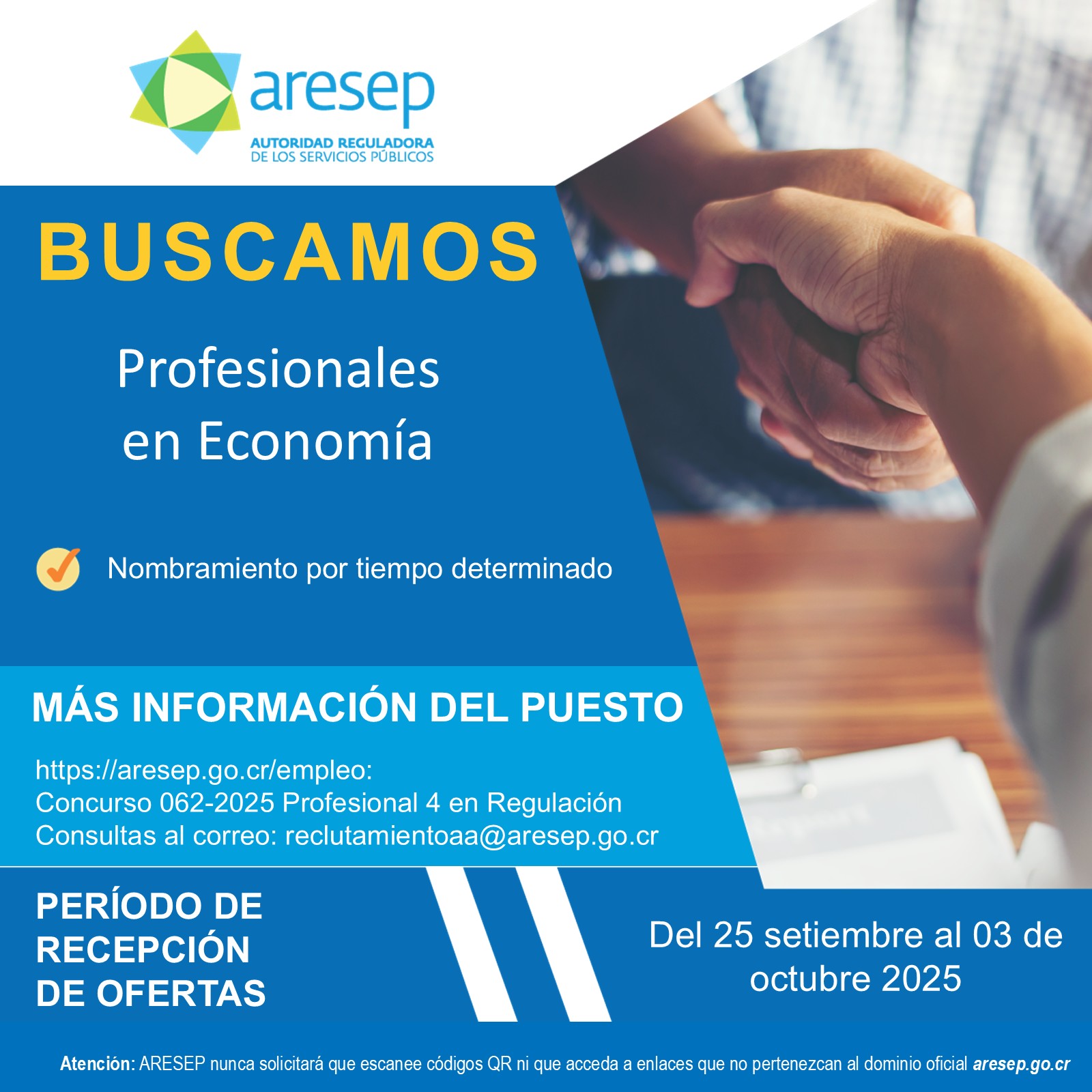 Profesionales en Economía en ARESEP Para aplicar al concurso lo pueden hacer por medio de https://web.aresep.go.cr/rrhh/empleo Puesto: Profesionales en Economía Empresa: ARESEP Jornada: Tiempo Completo Tipo: Puesto temporal Fecha de fin de concurso: 3 de Octubre de 2025 Más Información Adjunto